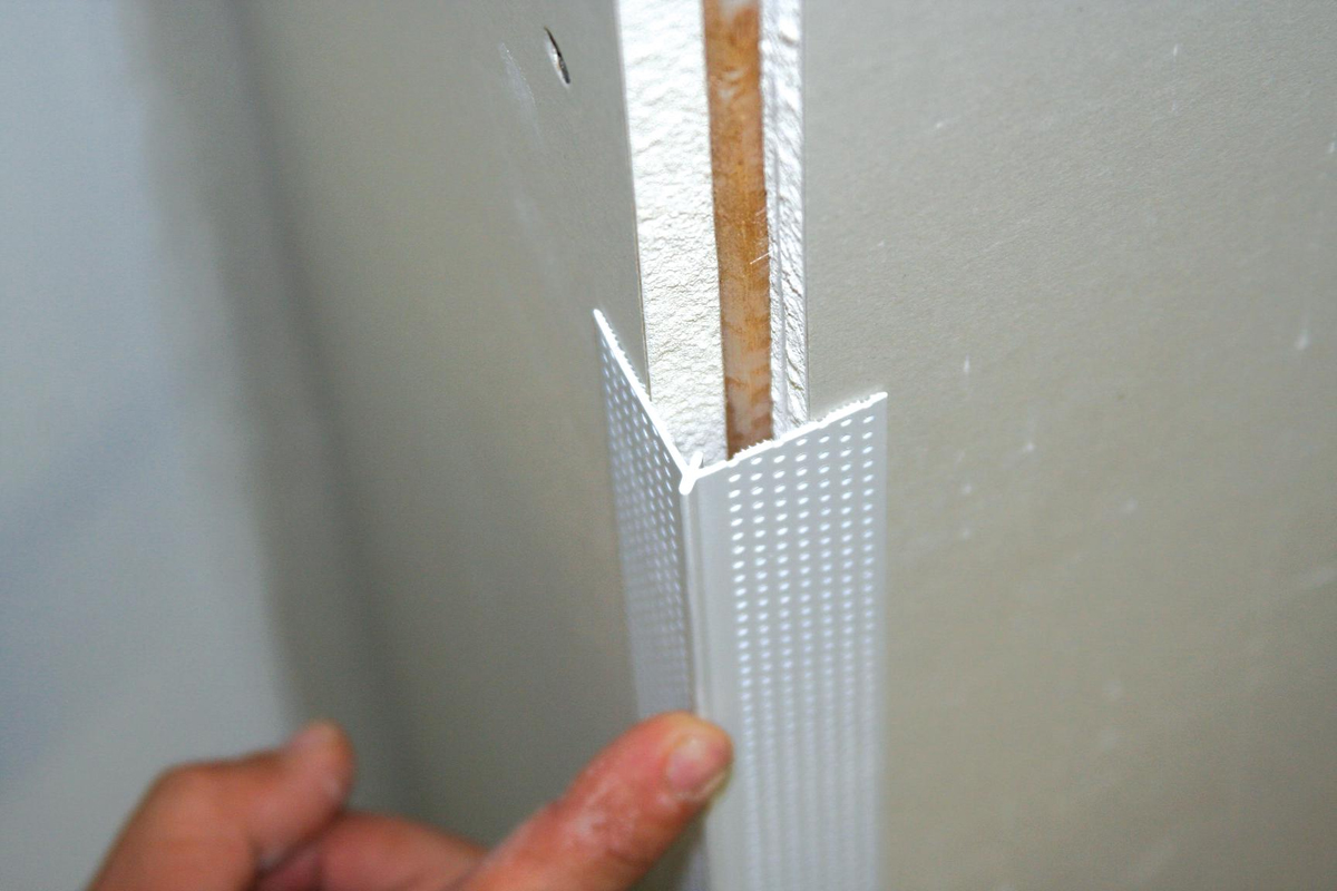 Нанесите слой шпаклевки на обе стороны угла и установите перфорированный уголок, слегка вдавив его в смесь. - Выравнивание.
