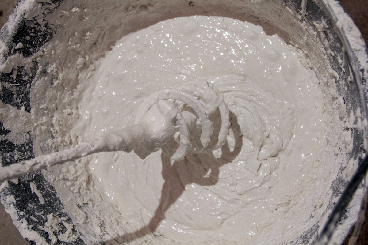 Готовая штукатурка должна иметь кремообразную консистенцию, которая не будет стекать со шпателя, но при этом будет легко распределяться по поверхности. Если смесь слишком жидкая, добавьте немного сухой штукатурки, если слишком густая — долейте воды.
